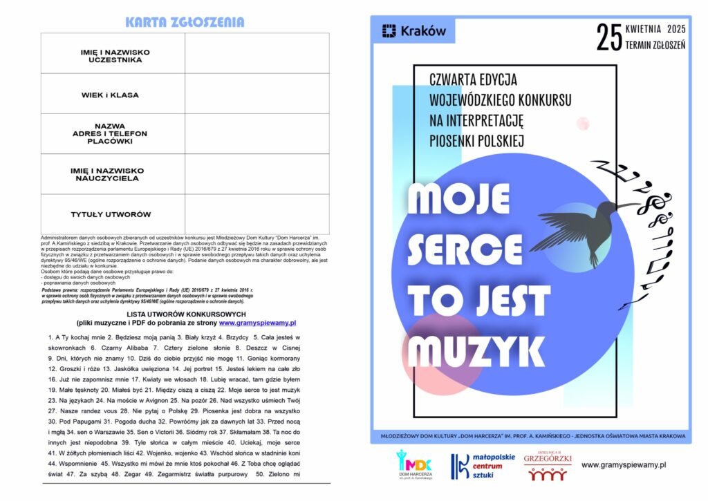 moje serce to jest muzyk 2025 Zapraszamy na czwartą edycję Wojewódzkiego Konkursu na Interpretację Piosenki Polskiej! Organizatorzy: MDK Dom Harcerza im. prof. A. Kamińskiego w Krakowie Małopolskie Centrum Sztuki Kraków Dzielnica II Grzegórzki – Kraków